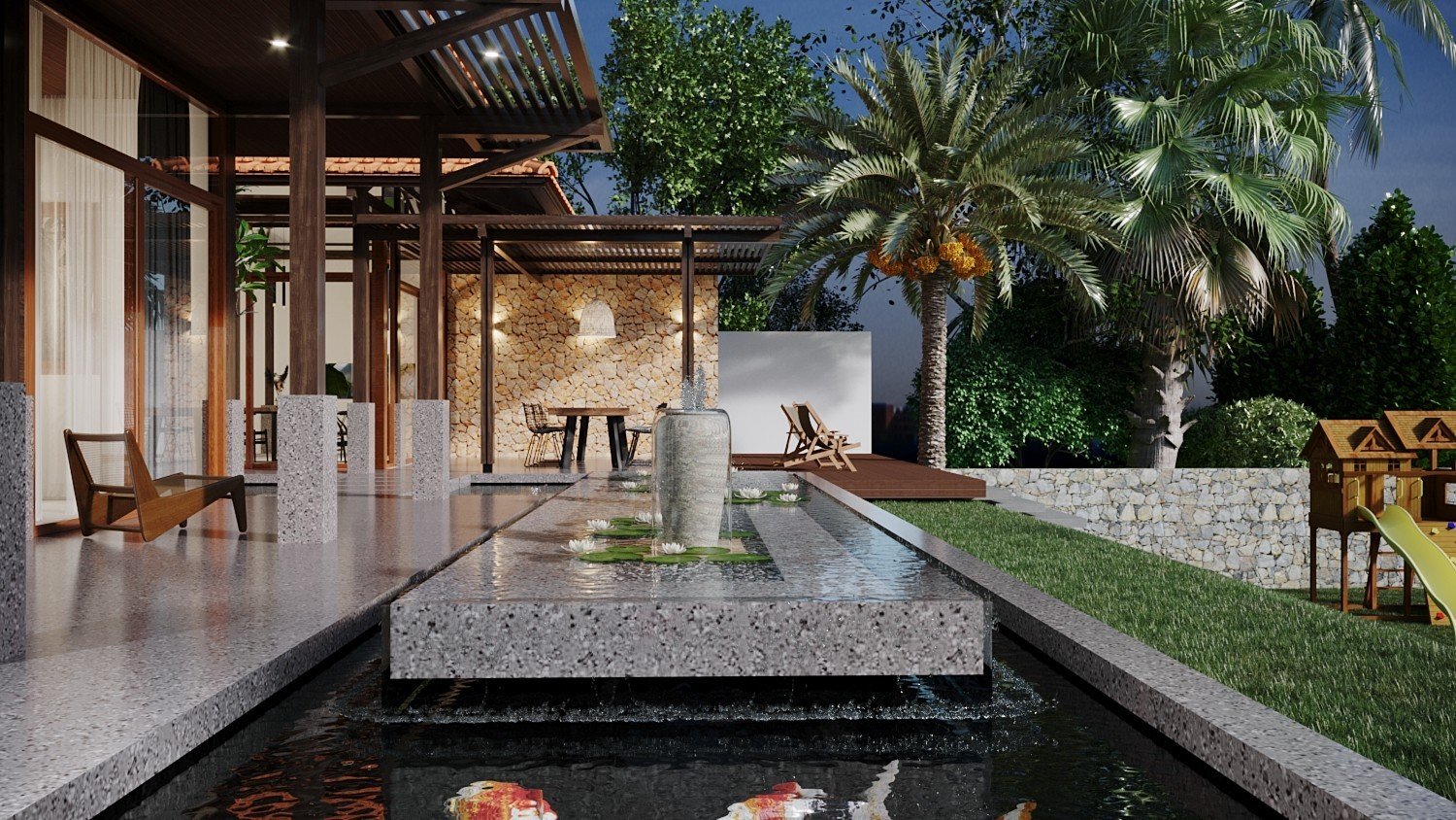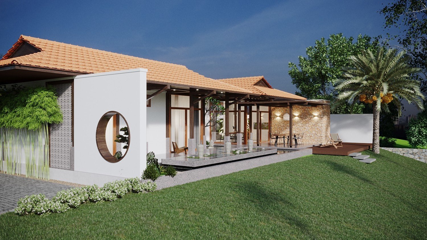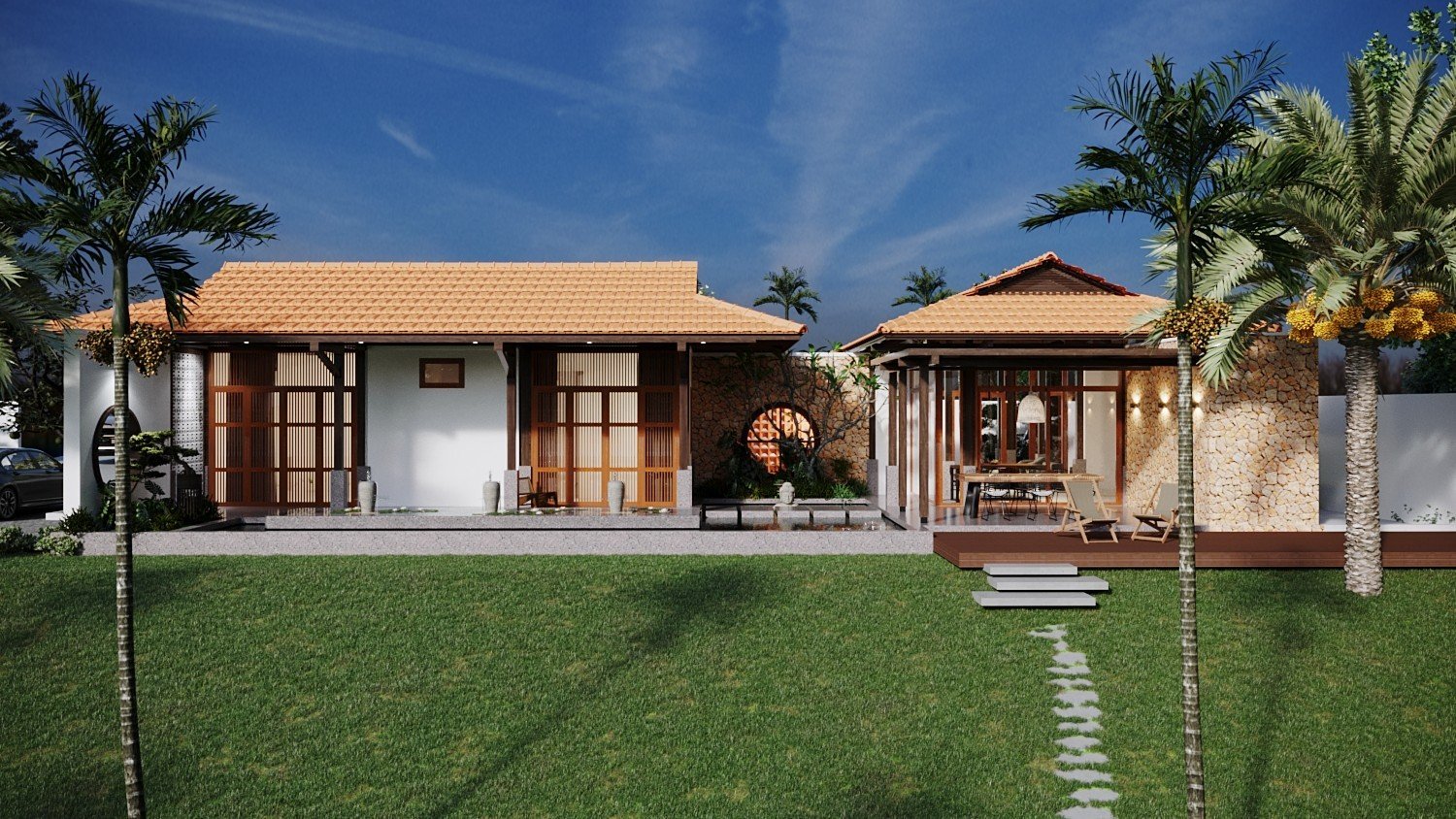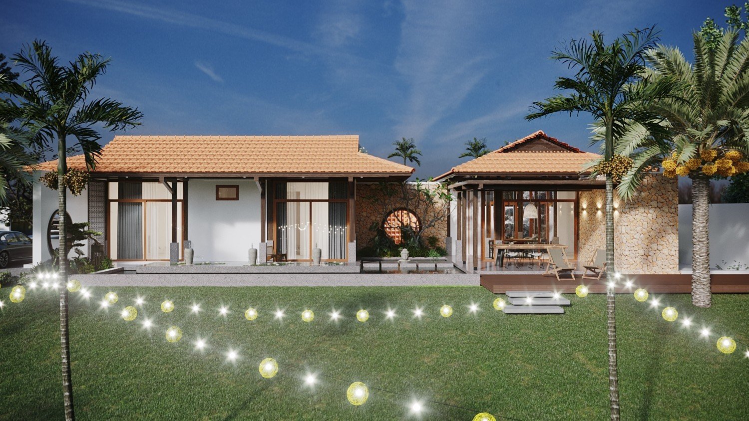 Một công trình nhà vườn đã được Kiến Trúc S hoàn thiện trọn gói, từ ý tưởng thiết kế 3D, lập phương án kiến trúc chi tiết, đến thi công và hoàn thiện nội thất một cách chuyên nghiệp. Ngôi nhà nổi bật với không gian xanh, sân vườn rộng rãi, tiểu cảnh hài hòa và cây xanh được bố trí tinh tế, mang lại cảm giác trong lành, mát mẻ và thư giãn tuyệt đối. Ánh sáng tự nhiên và gió trời được tối ưu hóa, giúp không gian sống luôn thoáng đãng và gần gũi với thiên nhiên.